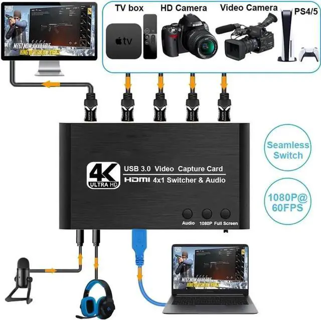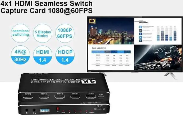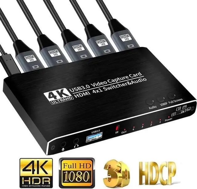 4X1 HDMI Seamless Switch Video Capture Cards 4 HDMI IN to USB 1080P USB3.0 Record via DSLR Camcorder Action Cam to PC or Mac.It supports 5 view mode,seamless switching,4K@30Hz HDMI IN/OUT,1080P@30FPS USB 3.0 and IR remote control.