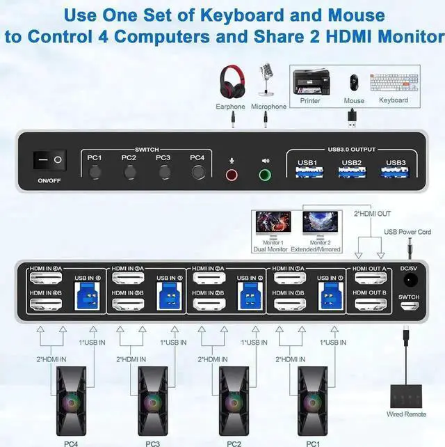 4 computers/laptops share one set of keyboard, mouse and dual monitors, USB 3.0 ports, microphone and audio port;