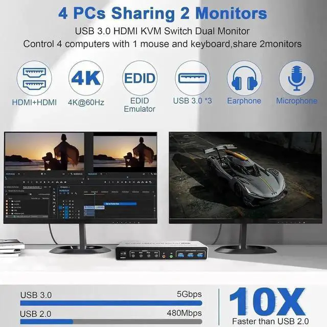 USB 3.0 4 Port HDMI + HDMI Dual Monitor KVM Switch 4K@60Hz for 4 Computers