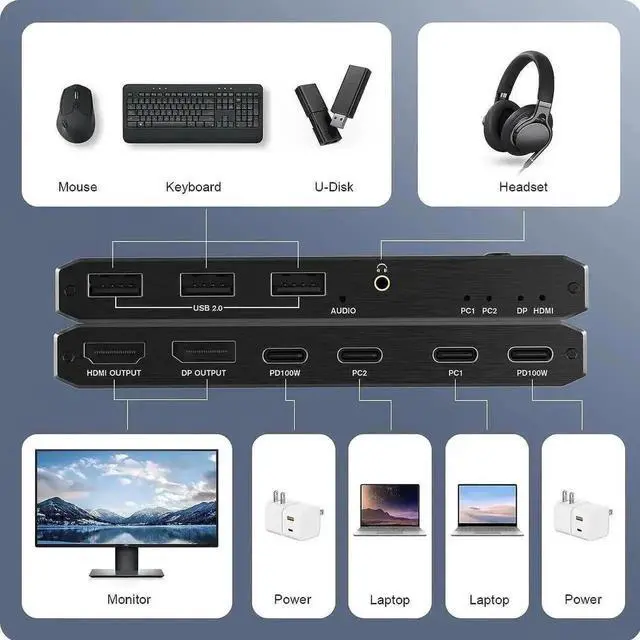 2 x USB-C 8K KVM Switch with one DisplayPort 1.4 or HDMI 2.1 Port for Video, with this 2 Port 8K KVM Switcher, you are able to connect from the switcher's two PC Input Port to your USB-C PC/Laptops via two standard USB-C Gen-2 Cable, then connect from the switcher's Standard DP 1.4 /HDMI 2.1 port to your Monitors via your own displayport 8K Standard Cable, you can press the ""Switch""button to switch between two of your PCs.
