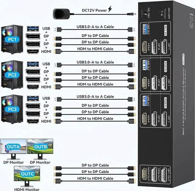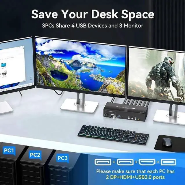 Note: (Your computer must support triple or multiple monitors to share 3 computers with 3 monitors with this KVM; each computer requires 1 x HDMI + 2 x DP + 1 x USB 3.0 cable to display 3 screens correctly)