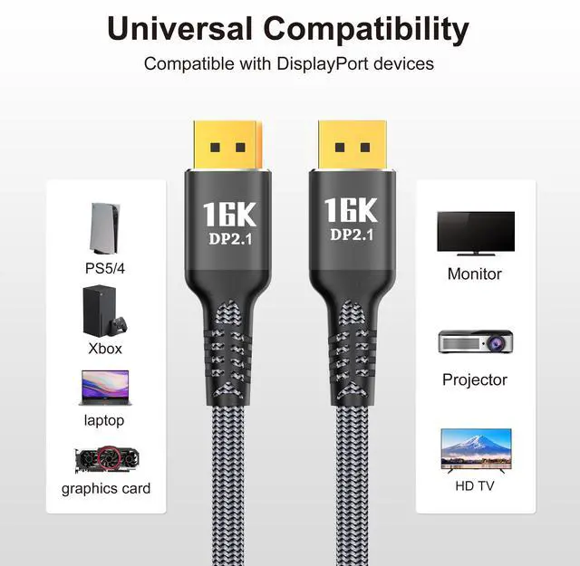 [Ultra HD 16K Displayport 2.1/2.0 Cable] 16K Displayport Cable 2.1 is designed to deliver stunning 16K@60Hz, 10K@60Hz, 8K@120Hz, 4K@240Hz/165Hz/120Hz/144Hz, 2K@360Hz visuals, ensuring an immersive gaming or viewing experience.