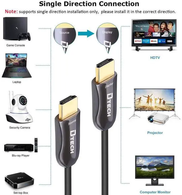 Installation Note: This Fiber Optic HDMI Male to Male Cable with Source Interface (Transmitter unit) for connecting HDMI source; Display Interface (Receiver unit) for connecting your HDMI display device.