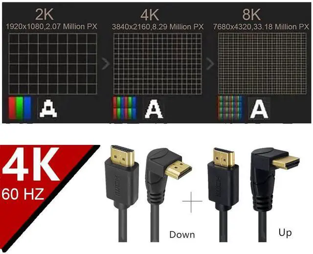 - Angle Support. This cable has designed different angles to adapt to market demand. Help different users solve special space connection problems. 4 directions: 90 degree Left angle to Straight HDMI. 90 degree Right angle to Straight HDMI. 90 degree Up angle to Straight HDMI. 90 degree Down angle to Straight HDMI. Please pay attention to choosing the right angle for your needs.