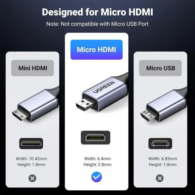 HDMI Cable: UGREEN Micro HDMI cable supports 8K@60Hz, 4K@240Hz, and 4K@144Hz Full HD resolution. It can help you to stream audio and video from a camera, tablet or laptop through the Micro HDMI Port to Your HDTV or projector with an HDMI port.