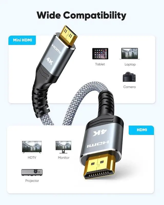 ![Alt view image 6 of 7 - Mini HDMI to HDMI Cable 10FT, 4K 60Hz High Speed HDMI to Mini HDMI Cable Male Bi-Directional 2.0 Cord, for HDTV, Tablet, Camera and Camcorder [Aluminum Shell, Nylon Braided]](https://c1.neweggimages.com/productimage/nb640/C2AGS25121707MXKI4E.jpg)
