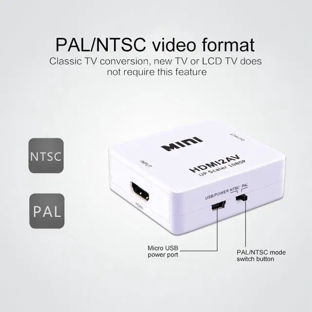 Composite input:PAL,NTSC3.58,NTSC4.43,SECAM,PAL/M,PAL/N. 6. Composite output: PAL,NTSC.Specifications:MINI HDMI to AV signal converter which will convert HDM video signal or audio signal to AV (CVBS) composite video signal and the FL / FR stereo audio signals, while support DVI system sideline signals.