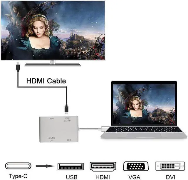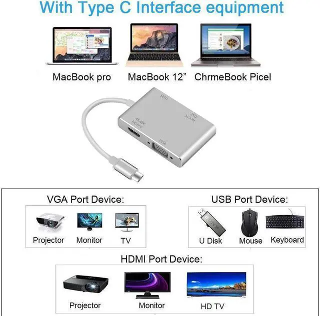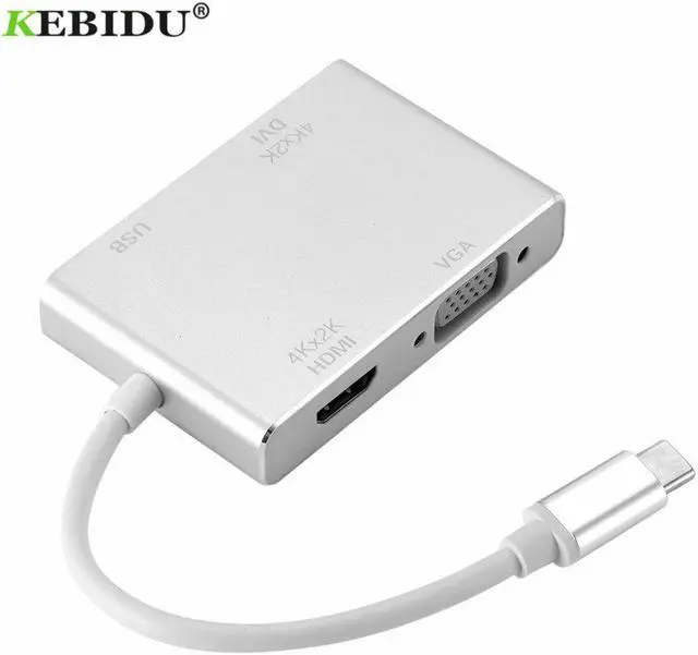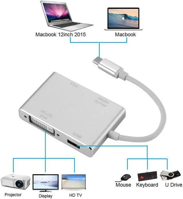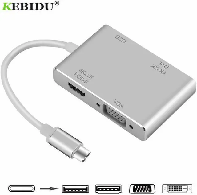 1.4-in-1. This Multiport Adapter convert your type-C port to 1x HDMI output, 1x VGA output, 1x DVI output and 1x USB3.0 output. Replaces need for multiple adaptors.