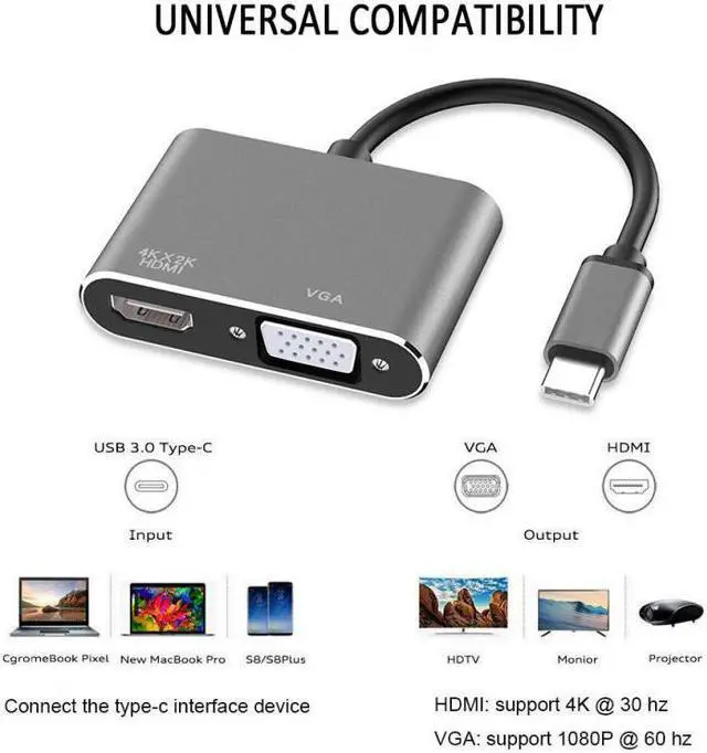 Support 4K Max C to HDMI VGA Adapter Supports video resolution up to (4K * 2K) at 3840 * 2160P / 30Hz. when use HDMI alone, It support a large screen liquid crystal TV or display compatible with 4K max output.