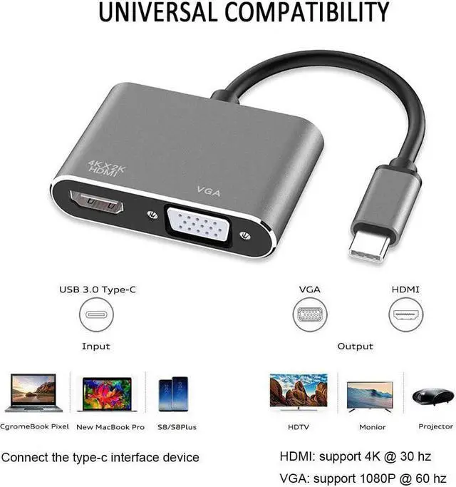 Support 4K MaxUSB C to HDMI VGA Adapter Supports video resolution up to (4K * 2K) at 3840 * 2160P / 30Hz. when use HDMI alone, It support a large screen liquid crystal TV or display compatible with 4K max output.