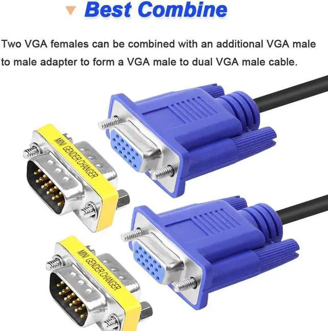 Combine: Additional two VGA female-to-female adapters can be combined with VGA male to dual VGA male cables to connect more VGA devices.