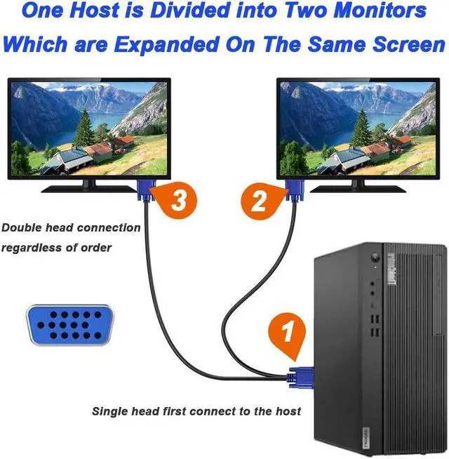 How to use: The VGA splitter Y cable has a single male connector that plugs directly into the computer, the other two male VGA sockets on the VGA splitter cable connect to the VGA cables of the two separate monitors.
