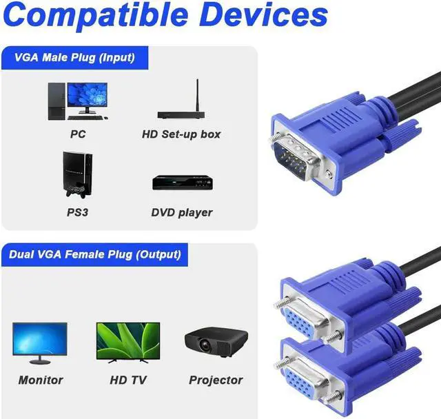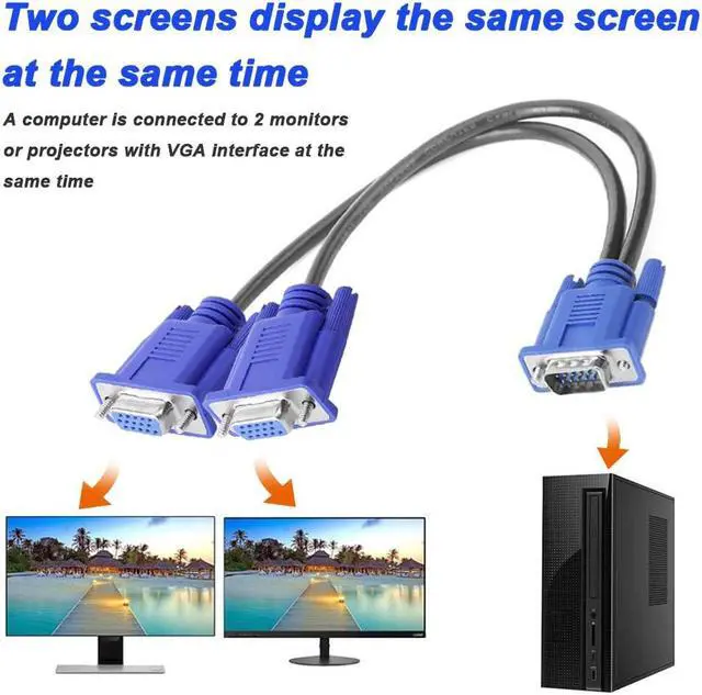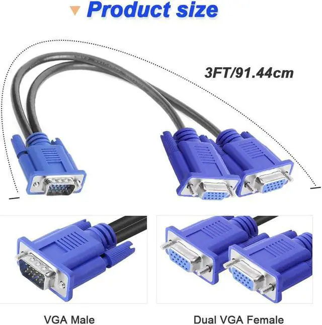 About VGA Dual Cable: This VGA male to dual VGA male monitor adapter can send the same VGA signal to two independent VGA monitors, so that the monitor screen can be copied to another monitor.