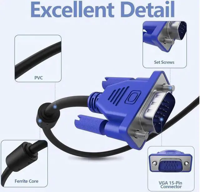 The VGA Cable is the ultimate link for connecting your desktop or laptop to a monitor or projector. The combination of gold-plated connectors, bare copper conductors, foil & braid shielding, and dual ferrite cores provides superior cable performance. Low impedance, signal distortion is small, 99.9 % reduction signal.