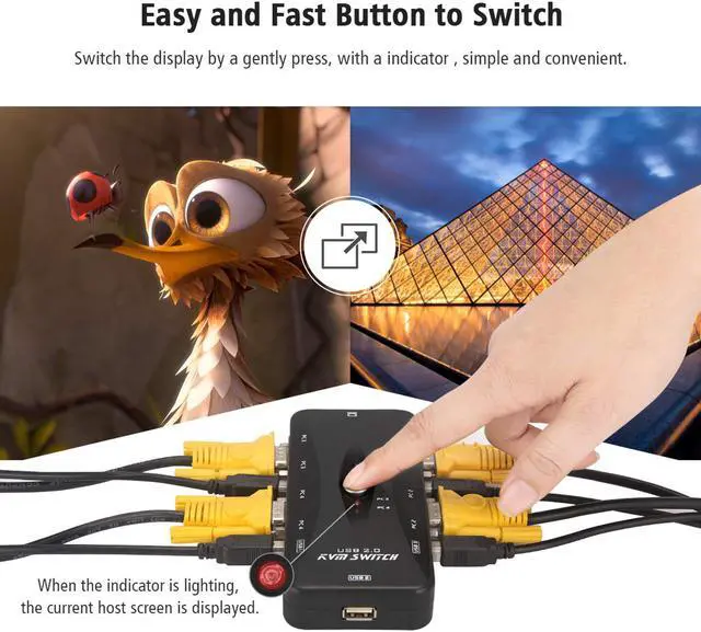 Description: This 4 port KVM Switch allows you to control four PCs from one USB keyboard and mouse! It is great for workstations, test benches or anywhere tasking between computers is needed. With support for 1920 x 1440 maximum resolution, this KVM is ready for any application. Portable and easily installed, switching between four computers is controlled by the push-button on top of the device.