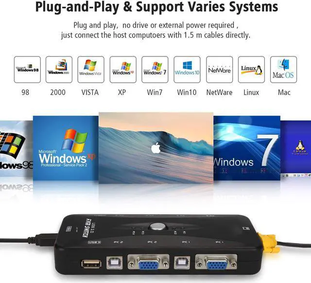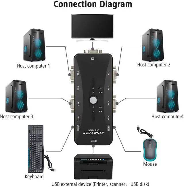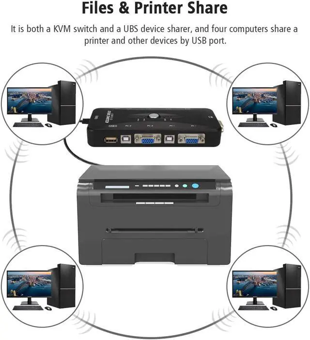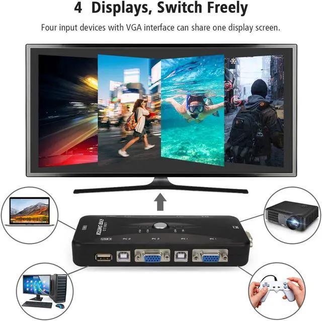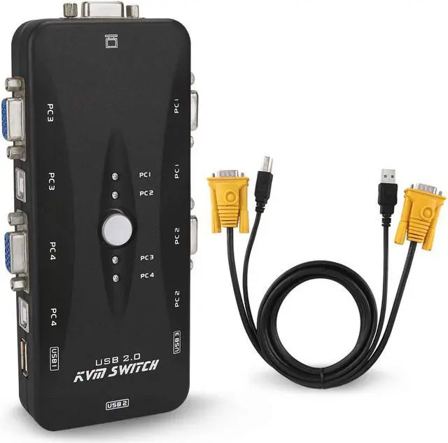 Features: 100% brand new and top quality Easily installed, Plug and Play, no driver USB 2.0 Port Connects keyboard and mouse to 4 PCs Supplied with four KVM cables for connecting to PC Maximum resolution 1920 x 1440 (but not for 1600*1220) Compatible with 98/98SE/2000/ME/NT/XP/VISTA/XP 64bit/Vista 64bit/Win 7 32bit/Netware/Unix/Linux/Mac 250 MHz bandwidth 4 LED indicators (PC1, PC2, PC3, PC4) Supports different interval latency auto-scan modes