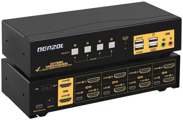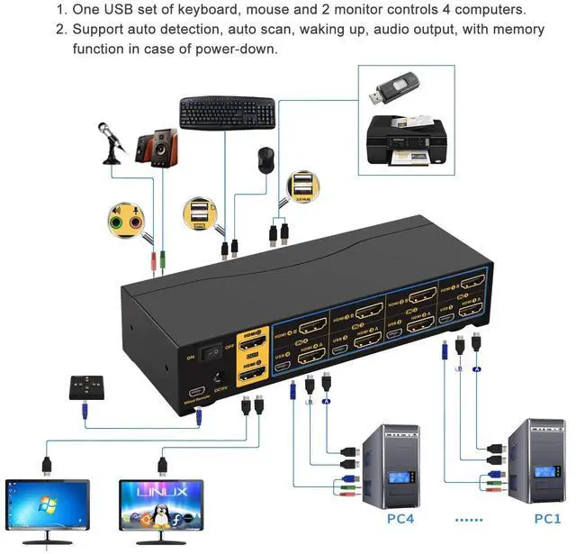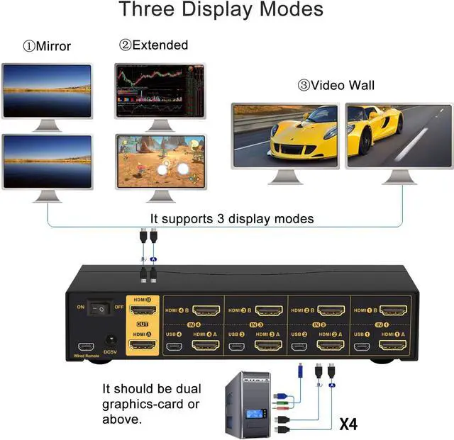 ?4 Port KVM Switch HDMI Dual Monitor?Controls up to 4 computers or laptops with Dual HDMI graphic outputs to share 1 set of keyboard, mouse and 2 monitors for extended or mirrored display.