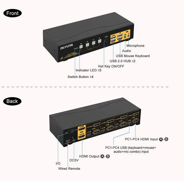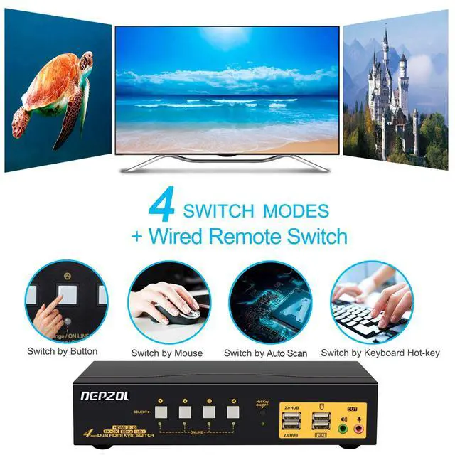 ?KVM Switch with Multiple Switching Methods?Easily switch between home desktop, work laptop or gaming machines via front button, keyboard hotkey, mouse clicks, wired remote and auto scan to meet various needs.