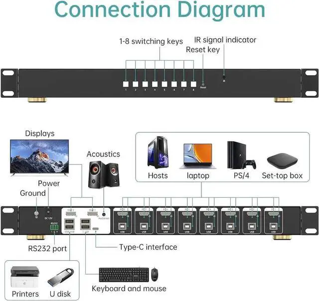 The 8 port HDMI KVM provides 6 switching options to suit your needs. you can use the IR remote, desktop controller, button, hotkeys, mouse and RS232 code switching, you can easily switch between HDMI sources and manage your devices with ease. Get rid of the hassle of constantly swapping cables between PC, desktop, laptop, monitor, gaming console and streaming device. Experience the convenience and efficiency of multi-device management.