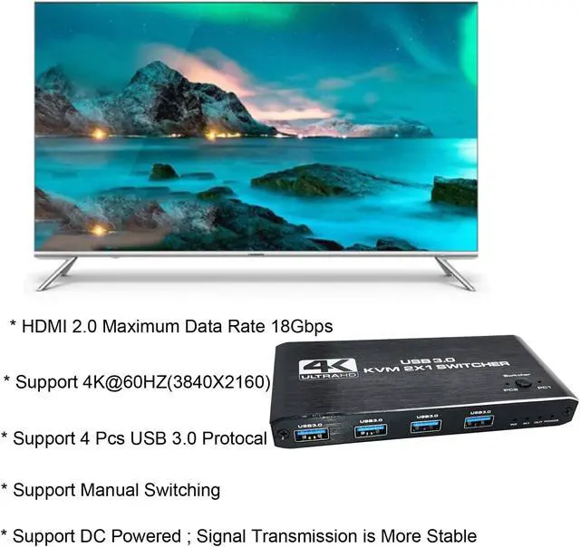 4K 2-Port HDMI KVM Switch Compatible with PC, Laptop, Apple TV, PS3/PS4/PS5, Xbox, Sony Blu-ray Player, Projector, Audio/Video Receiver, and Most Devices that support HDMI. High-speed transmission without delay, without loss of picture and sound quality. (HDMI switches support wireless keyboards and other USB devices can be recognized)