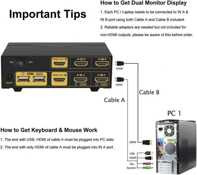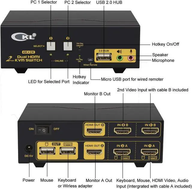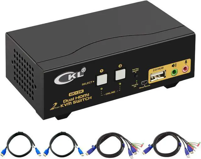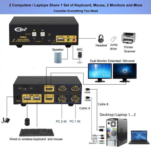 Dual Monitor KVM Switch HDMI 2 Port: Consoles control up to 2 computers or laptops with 1 independent set of USB keyboard, mouse and monitor or 2 monitors extended or duplicated display with dual head input. The best KVM Switch to make your work space tidy and efficient, also a premium choice for working from home.