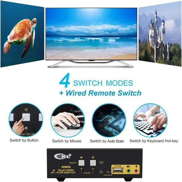 HDMI SWITCH BOX WITH CONVENIENT SWITCH MODES: 1. Hot key switching on keyboards that support all operation system; 2. Switch via Mouse Click (Industry Leading Technology); 3. Toggle selection on front panel; 4. Auto scan switch with adjustable interval (8-999 second). 5. Wired remote switch (one-touch switch)