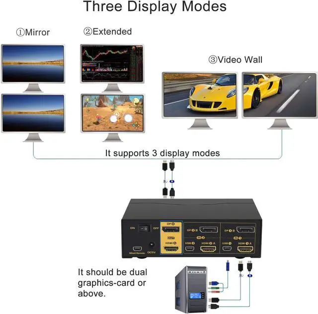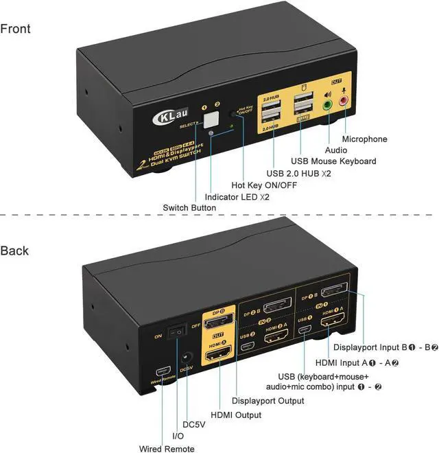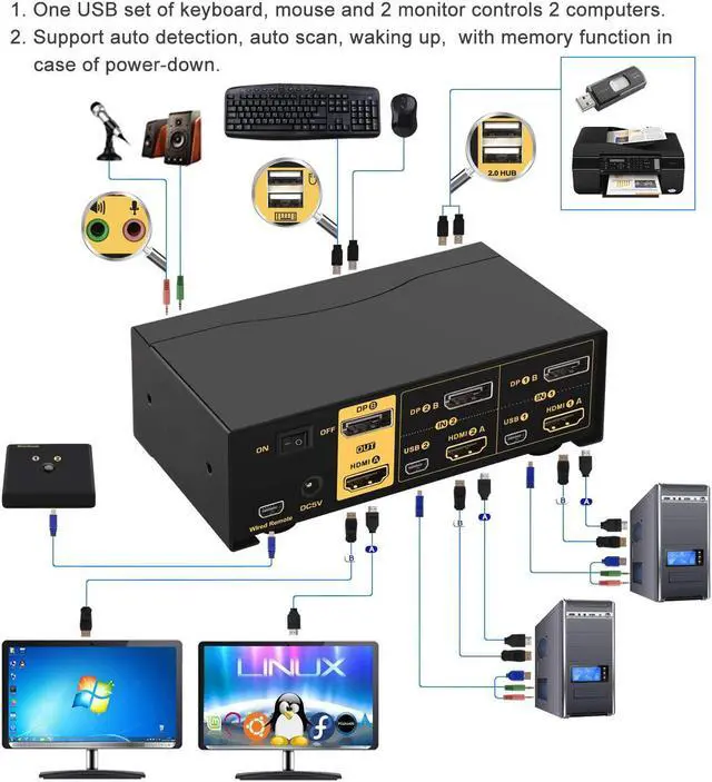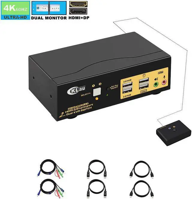 KVM Switch with HDMI + Displayport: one set of keyboard, mouse and 2 monitors controls 2 HDMI+displayport computers/laptops. With audio and mic output, 2 pcs USB 2.0 HUB, 2 kits cables and a wire remote control push button switch. (Tips: it is DP1.2 60Hz version for displayport port, it doesn't compatible DP1.4 version, 100Hz, 120Hz, 144Hz devices)