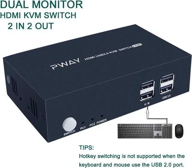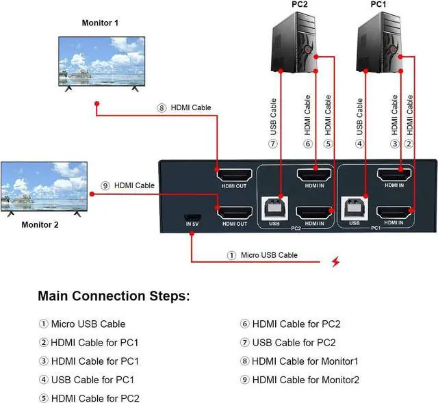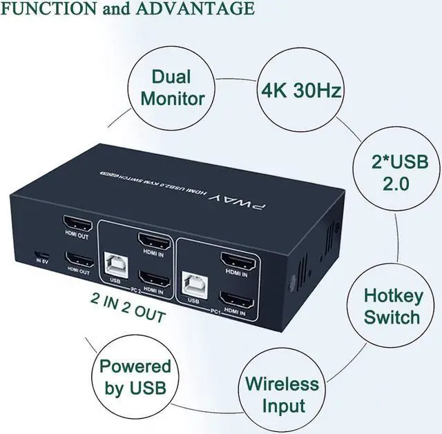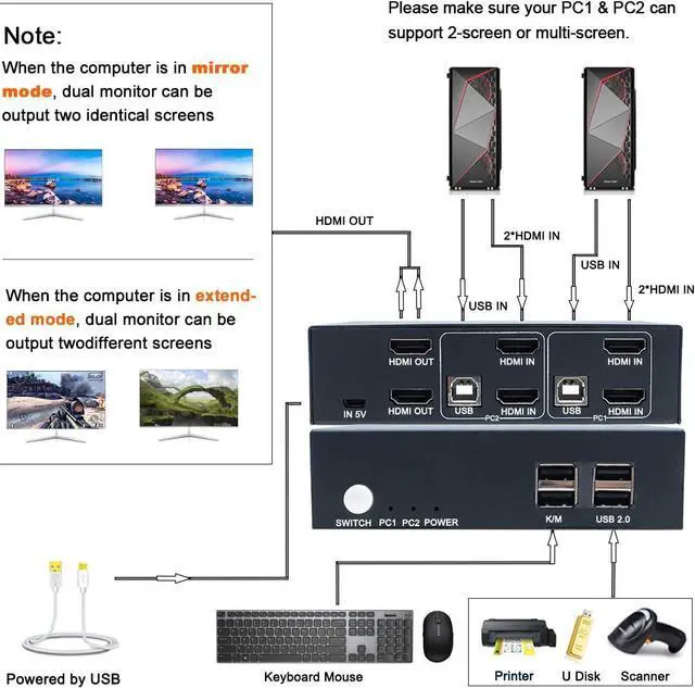 KVM SWITCH DUAL MONITORThis kit help you use 1 set of keyboard and mouse to control 2 computers share 2 monitor, you can switch anytime. It requires each computer support 2 screen display functions. Highly recommend using a source with dual HDMI ports for use with this product, otherwise, that need VGA/DVI/ DP to HDMI convertor or docking station. Please choose the high quality devices, if the convertor/docking station is not good quality, it may lead to not display or reduce the resolution.