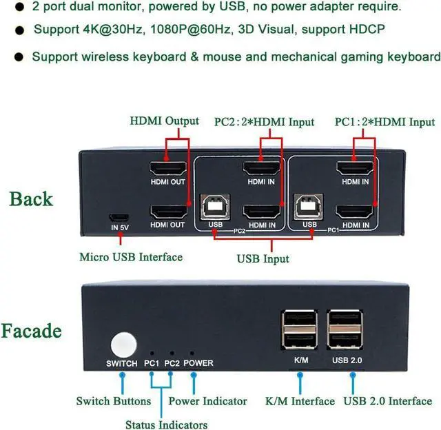 HDMI KVM UHD 4K@30Hz Support 4K x 2K@30Hz/3D/1080P resolution, make the image display more exquisite and realistic. You can enjoy the most luxurious video with this HDMI KVM dual monitor Switch.