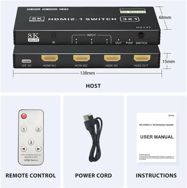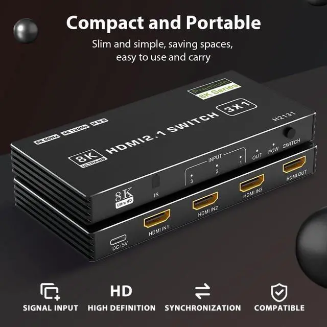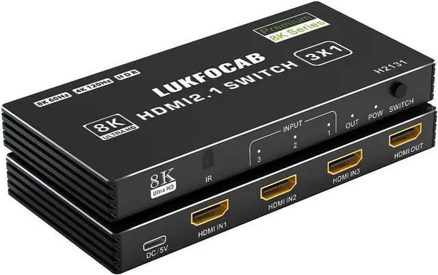 HDMI Switch 3 in 1 out: LUKFOCAB 8K 3x1 HDMI 2.1 Switch can connects up to 3 HDMI video sources to a single display and switch. Features with two switching methods, manual switch and remote control, which frees you from plugging and unplugging HDMI cables