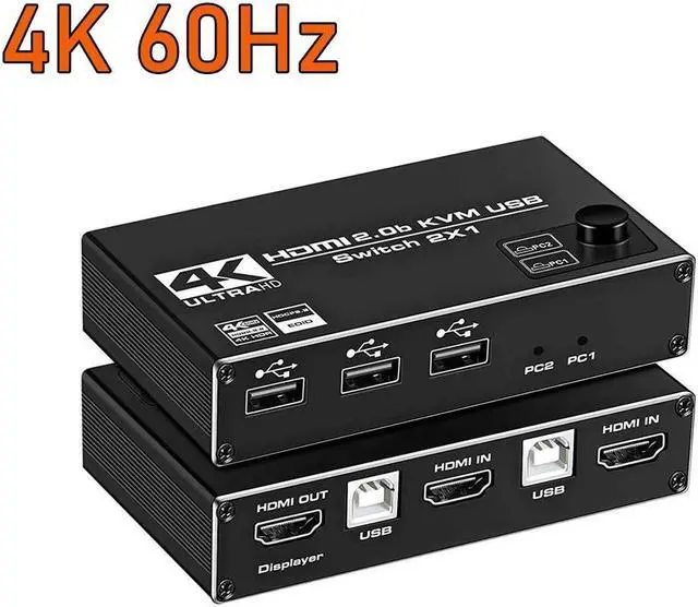 The HDmatters 2x1 HDMI KVM Switch with USB supports HDMI 2.0, HDCP 2.2, 4K@60Hz and USB HDMI KVM/Extension. The 4k HDMI KVM Switch allows control of 2-computers with one set of controls (keyboard and mouse) and a display screen. It supports 2-inputs and one output. You can centrally control and manage a host's laptop or game console without having to manually move between one workstation to another.