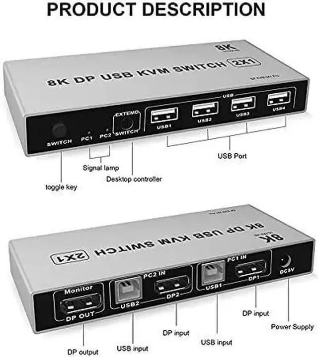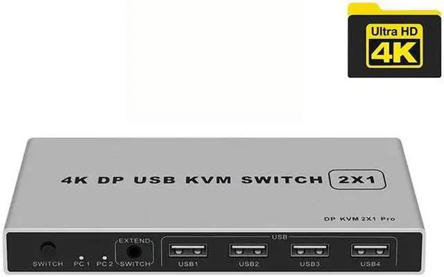 A 2-portUSB DisplayPort KVM switch that allows users to switch between 2 computers from single USB keyboard and Mouse. The device is simple and convennt to install