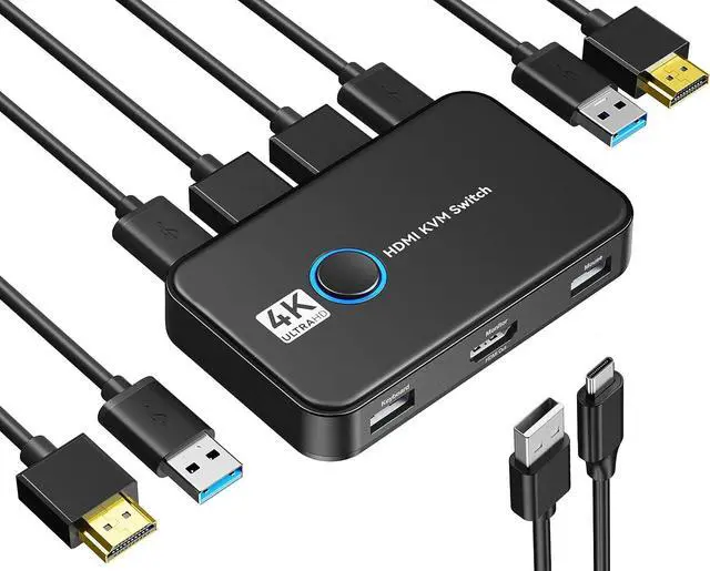 Included All Needed CablesThis KVM Switch comes with 2 pack 120cm( 3.94 ft) hdmi cable and 2 pack 120cm( 3.94 ft)usb 3.0 cables, 1 pcs usb c charge cable, no need to spend extra money on cables.