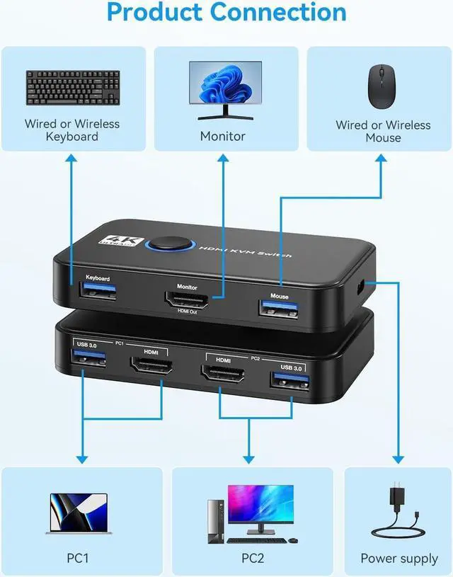 What You Get: 1*KVM Switch, 2*HDMI cable, 2*USB 3.0 Cable, 1*User manual, If any issue, please contact us to solve, we provide 24-month warranty and 24h professional customer service and technical support.