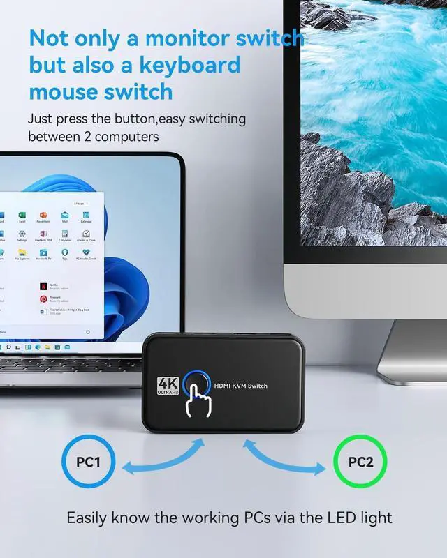 Free UP Your Desk SpaceOur KVM switch save your desk space when you need to use two computers, you can easily switch between 2 computers and usb devices without all the clutter. No longer have to go thru the hassle of swinging the hdmi cable and usb cable back and forth anymore, improve your work efficiency greatly.