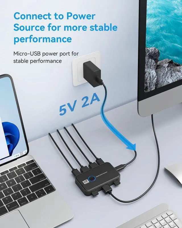 Support 4K ResolutionThis HDMI USB KVM switch supports resolution up to 4K@60Hz, which can make image display more exquisite and realistic, color is more bright and moving, really give a feast for your eyes. Of course, it also support 4K@30HZ, 3D and 1080P or lower resolution. Data transfer speed reach up to 5 Gbps for usb 3.0 ports.