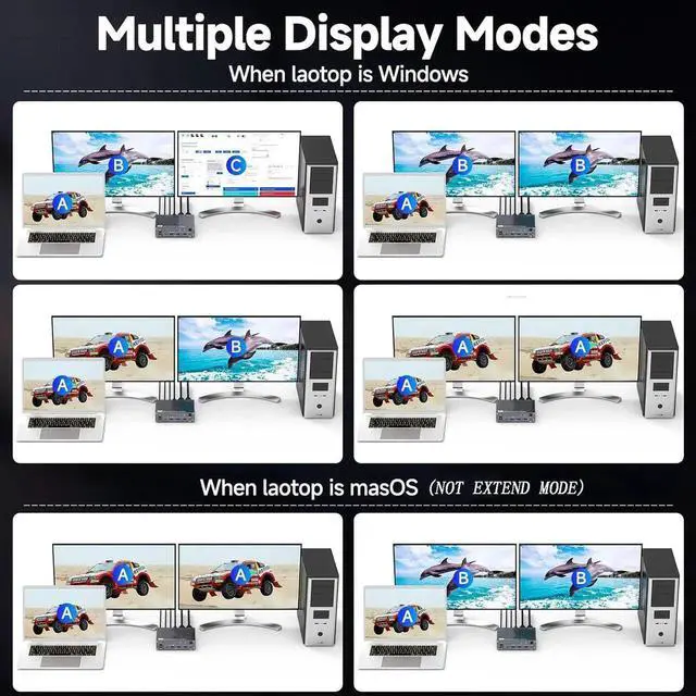 Note: Only support mirrored output on macOS. USB-C KVM Switch 2 Monitors supports extension mode and copy mode for Windows laptops and desktops.