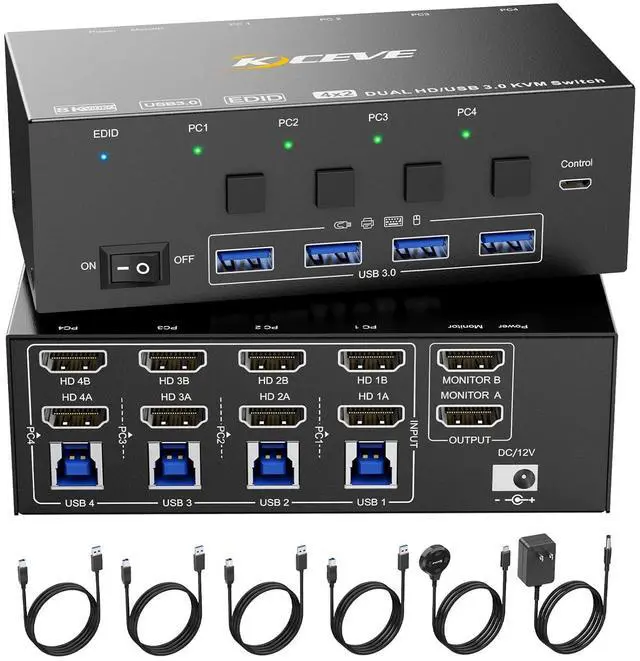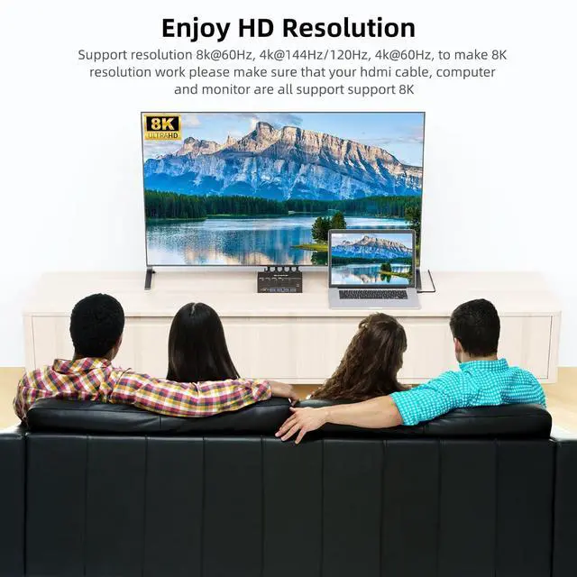 This HDMI DualMonitor 4 port kvm switch supporting high resolution max up to 8K@60Hz,and also supports 4K@60Hz or other lower resolution (DownwardCompatible). Complies with HDMI2.1 standard. Support up to8K@60Hz for extended and mirrored display. Note: Only when both yourcomputer Graphics card, monitor and HDMI cable support 8K@60Hz thenyou can get 8K@60Hz effect.Plug and play, drive-free, compatible with a variety of computer systems, such as Win10 / 8.1 / 8 / 7 / XP / Vista, Mac OS, Linux, Chrome OS.