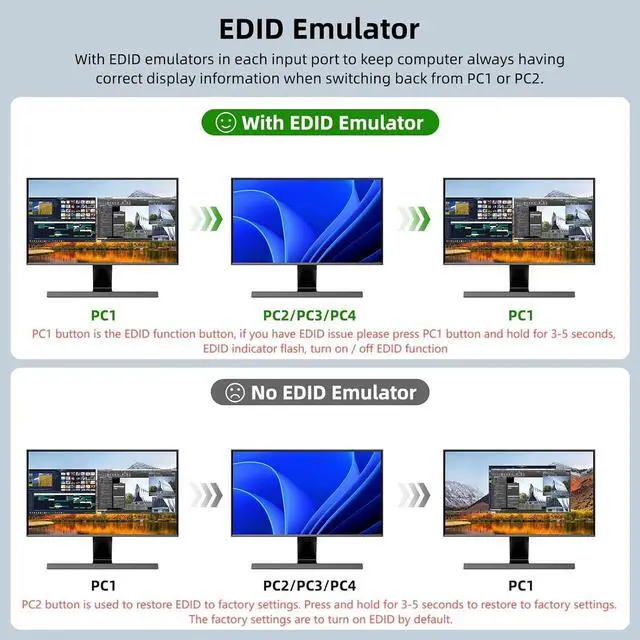 USB 3.0 KVM Switch with EDID emulators in each input port, keep computers always having correct display information when switch back.For most KVM switch on the market are not support EDID locking sreen function, its not very convenient sometimes.In COPY mode, 2 output monitors will output same image from PC1 or PC2.In EXTEND mode, the working window from main screen can be dragged to seond output monitor. You can have the mouse across between 2 monitors.If EDID doesn't work, please try the follow way to fix it. 1, press "PC1" button and hold for 2-3 seconds to turn on or turn off the EDID function; 2, press "PC2"button and hold for 2-3 seconds to restore factory settings.