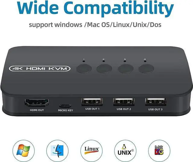 Ideal Sharing Switches: The HDMI USB KVM Switch can share one HD 4K monitor and 3 USB 2.0 devices such as scanner mouse keyboard between 4 computers.