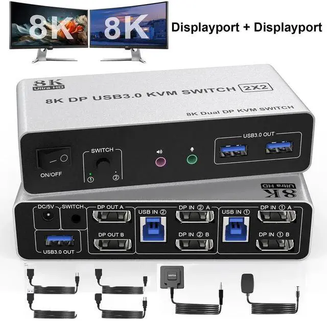 1. KVM Switch Displayport 2 port allows 2 computers/laptops share one set of keyboard, mouse, and 2 monitors (DisplayPort+ DisplayPort)