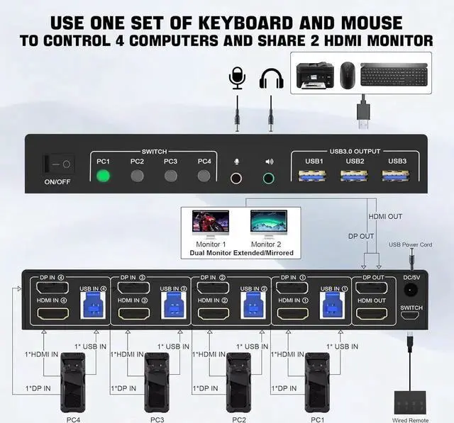 With this 4 port USB 3.0 dual-monitor DisplayPort + HDMI KVM Switch (DisplayPort + HDMI), you can easily control 4 signal sources at the same time, share the same keyboard and mouse, and share 2 monitors.