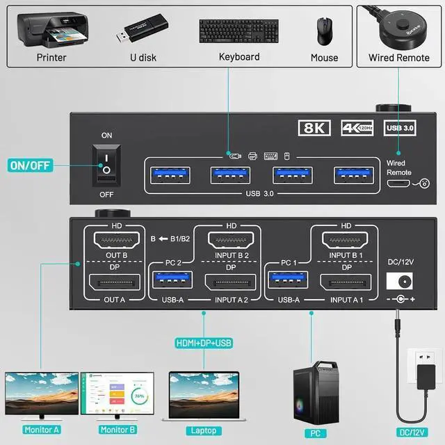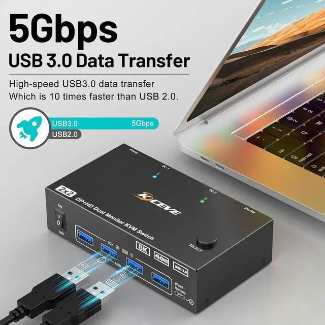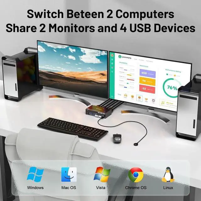 The 2 monitors KVM switch compatible with USB-C docking station, USB C to HDMI, USB C to Displayport, Displayport to HDMI cable or converter.