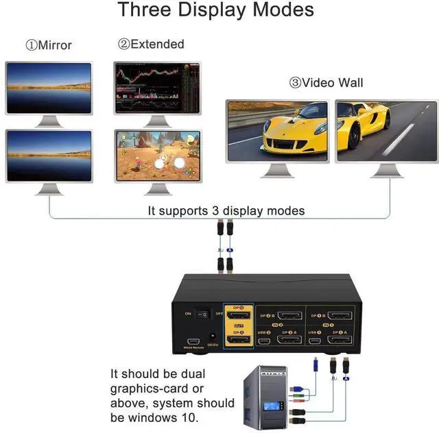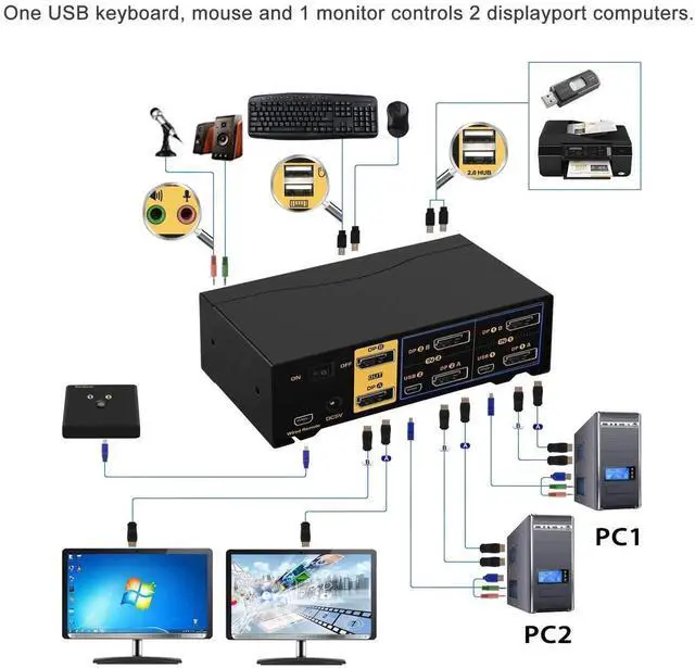 [DISPLAY PORT KVM SWITCH WITH ADVANCED SWITCHING MODES]It provides several switching options for different scenarios: 1. Keyboard Hotkey. 2 Mouse click. 3 Push button. 4 Wired Remote. 5. Auto scan with adjustable interval (for monitoring and testing)