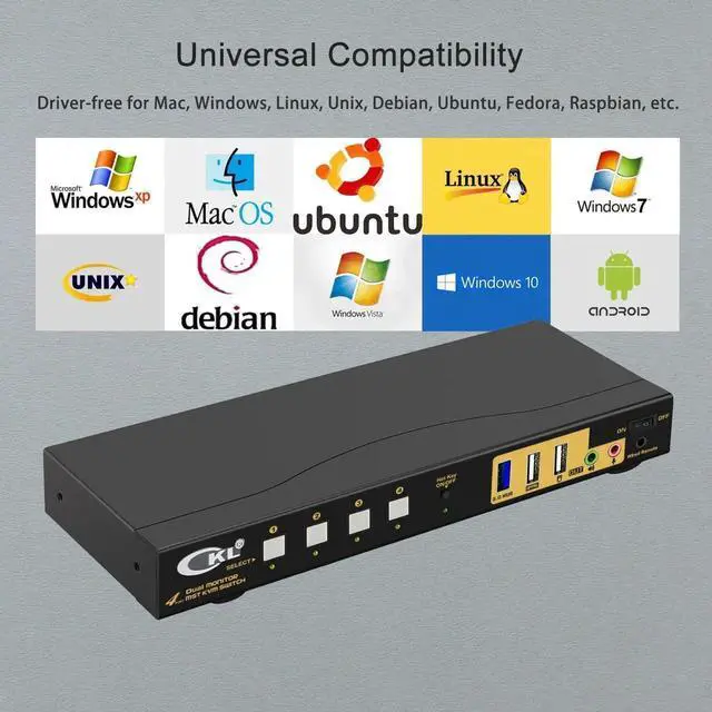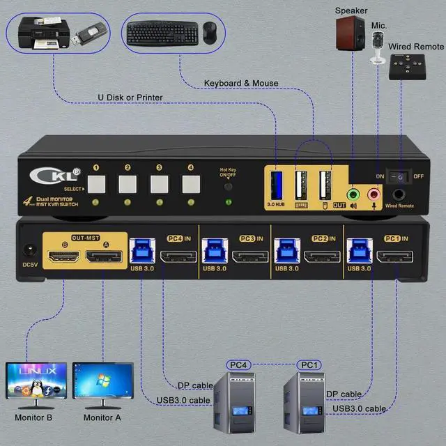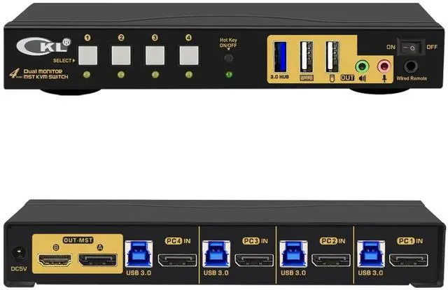 [4 Port KVM Switch Dual Monitor DisplayPort+HDMI] Control 4 computers from a single set of keyboard, mouse and 2 monitors. 1 DP 1.4 input to DP + HDMI outputs for each computer. Works for Laptop with USB Type C video port using USB C to DisplayPort adapter.