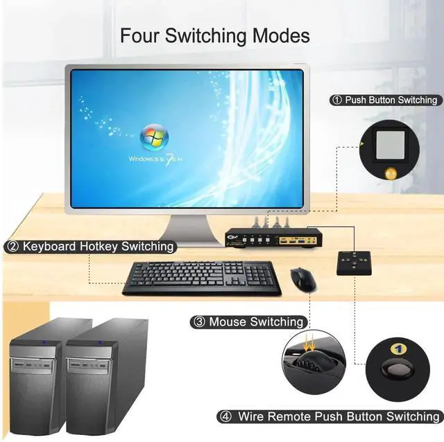 SWITCHING METHODS: Supports more switching methods than others to meet with different needs, including keyboard hotkey, mouse hotkey, push button, wired remote and auto scan;