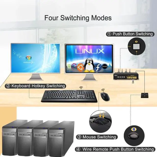 SWITCH METHODS: Supports more switching methods than others to meet with different needs, including keyboard hotkeys, mouse hotkeys, push button, wired remote and auto scan;
