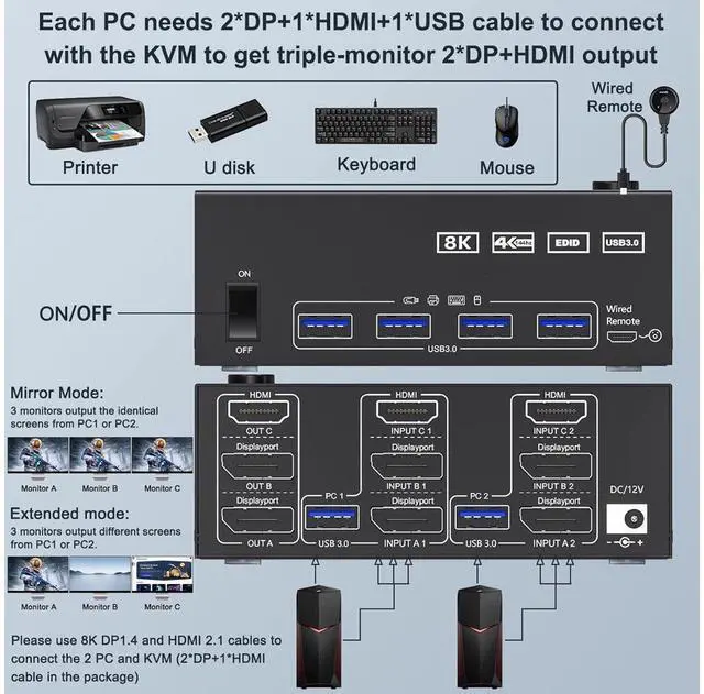 ![Alt view image 6 of 7 - Triple Monitor 2 Displayport + HDMI KVM Switch 8K@60Hz 4K@144Hz, [HDMI + 2 Displayport] KVM Switch for 2 Computers Share 3 Monitors and 4 USB 3.0 Device, with Wired Remote and 5 Cables eokCXOY](https://c1.neweggimages.com/productimage/nb640/C2AGS25110408D9CI23.jpg)
