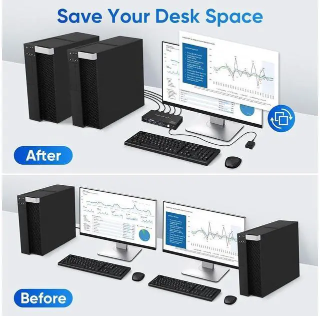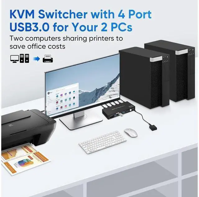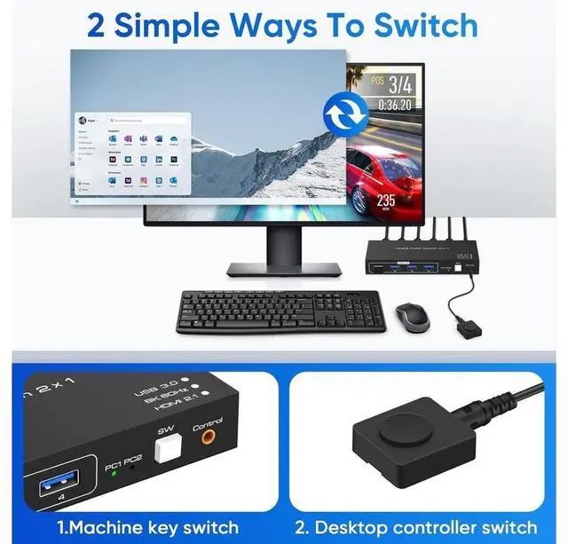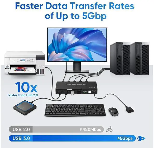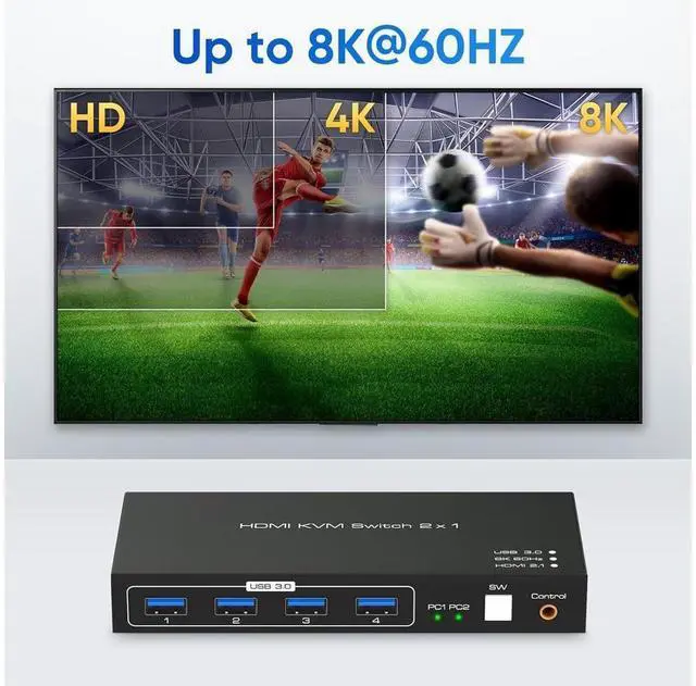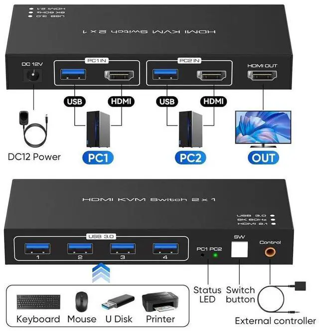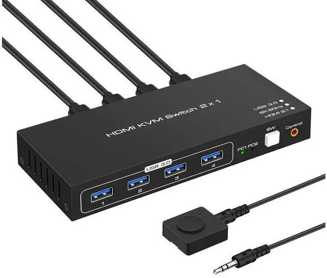 The KVM switch has 2 × HDMI 2.1 input, 2 × USB 3.0 input, 1 × HDMI 2.1 output, 1 × USB 3.0 output, 3 × USB 2.0 output, button switch, wired remote jack, and DC 5V jack. Allow you to share 4 USB peripherals between 2 computers, with a data transfer rate of up to 5Gbp/s (10 times faster than USB 2.0 ). The upgraded design hides the messy cables on the back, leaving four USB ports on the front for inserting USB flash drives, keyboards, mice, printers, scanners, webcams, and hard drives.