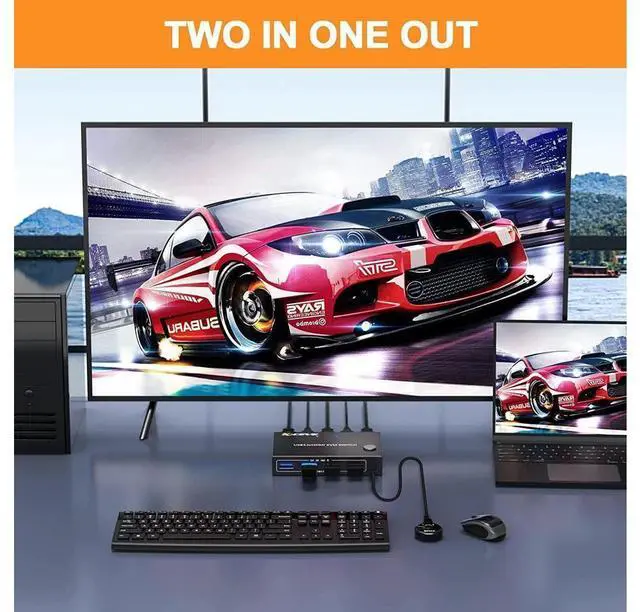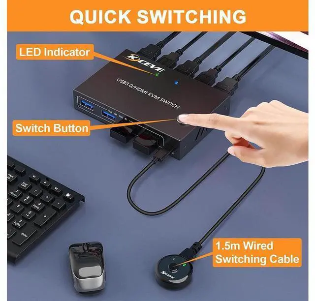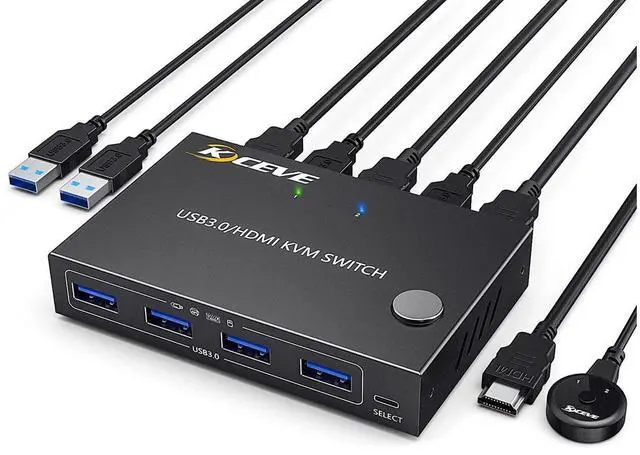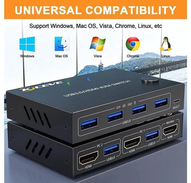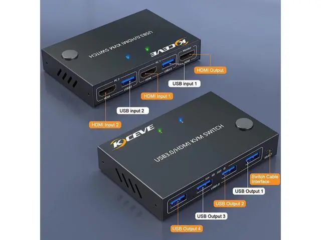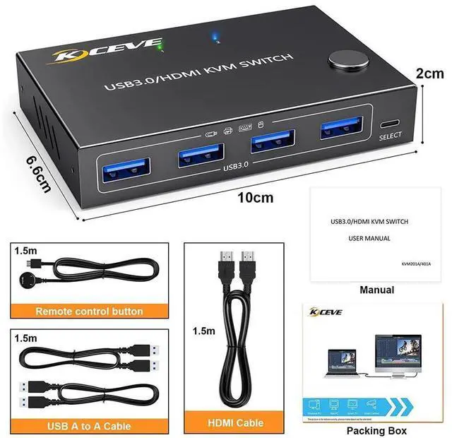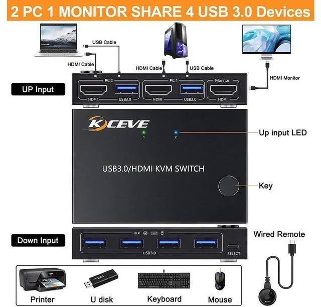 [HDMI KVM Switch 2 PC Share 1 Monito] This KVM Switch 2 ports can realize 2 computer inputs 1 display output, connect up to 4 USB 3.0 devices. The USB KVM switch allows 2 PC, 1 monitor to share, controlled by a set of wired/wireless mouse and keyboard, also supports printer, scanner, webcam.